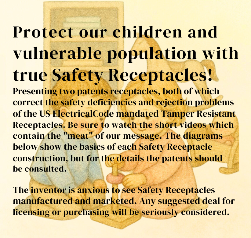 In this website we offer a very brief description of the prototypes of both patent designs, and then we will discuss the shortcomings of the tamper resistant receptacles which are presently mandated by the US Electric Code for all new construction and renovation.